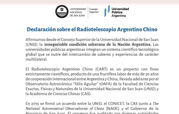 El Consejo Superior de la Universidad Nacional de San Juan planteó la “innegociable condición soberana de la Nación Argentina” para defender el proyecto del Radiotelescopio Argentino Chino, frente a presiones externas.
