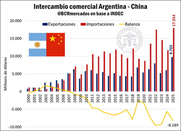 La Bolsa de Comercio de Rosario informó que las exportaciones a China fueron por 3.770 billones de dólares y las importaciones por 2.580 billones, resultando en una balanza comercial superavitaria cercana a los 1.200 billones, un máximo histórico.