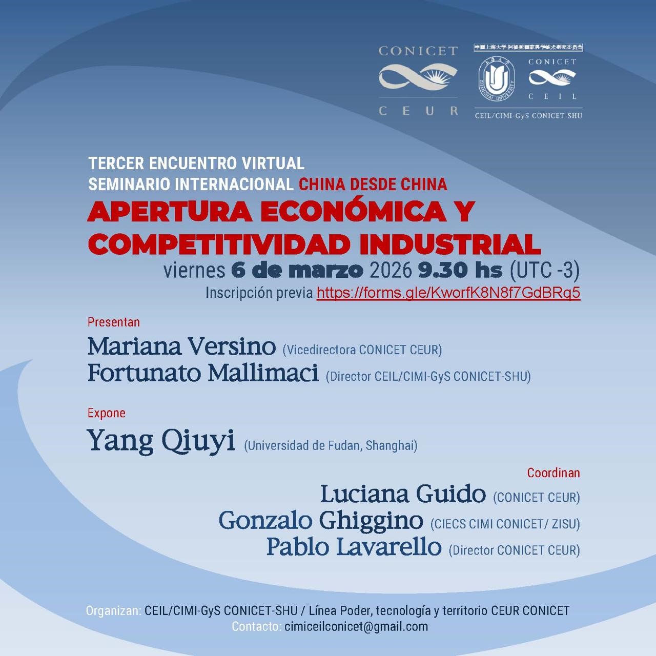 Junto con la línea Poder, Tecnología y Territorio”, del CEUR-Conicet, se hará este viernes con la participación del profesor de la Universidad de Fudan Yang Qiuyi, las presentaciones de Mariana Versino (CEUR) y Fortunato Mallimaci (CIMI – CONICET-SHU) y la coordinación de los también investigadores del organismo argentino Luciana Guido, Gonzalo Ghiggino (desde China) y Pablo Lavarello.